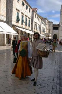 このプラツァ通りは、ピレ門からルジャ広場まで約300メートルを結ぶドゥブロヴニク旧市街のメインストリートで、もともとは長細い海峡でした。かつて、その海峡を挟んで海側にはローマ人が、そして山側にはスラブ人が住みはじめ、二つの異なる民族の境界線だったのですが、1272年の法令によって海峡が埋め立てられたことで通りとなり、そこは一つの町となりました。