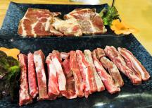 おすすめは極上胸肉(雪花双流星肉・65元)、特製タレに漬け込んだ牛肉(雪花調味牛肉・46元)、肉厚のサムギョプサル(猪五花・40元)などで、4皿2人用140元のコースもあり、焼き魚やムチム(和え物)などのサイドメニューも充実しています。