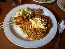 ナシゴレン・スペシャル(65,000ルピア)にはチキンのサテ(串焼き)が付いてきます。目玉焼きじゃなくてスクランブルのトッピングがほわっとのってるのもなんだか’懐かしい口当たりで気に入ってます。添えてあるサンバル(唐辛子とエシャロット等で作った調味料)は辛いものが苦手な方は気を付けてほんのちょっと試してからが安心。ナシゴレンやナシチャンプル(ご飯と惣菜の盛り合わせプレート)はガドガド(ピーナツソースのサラダ)とのハーフ&ハーフのメニューがあるのも嬉しい。
