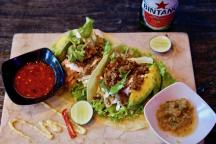オススメはなんといってもタコス。このお店の王道のバビグリンタコスはRp.90,000(¥720程度)とバリ島のワルン(食堂)に比べ少し値段は高めですが、お客さんからの熱い人気を集めています。今回はスタッフオススメのアボカドタコス(Rp.65,000、¥520程度)をオーダーしましたが、2種類付いてきたチリソースとパクチーソースとの相性が良く味に飽きることがなく食べることができました。是非違うものも試してみたくなる一品です。