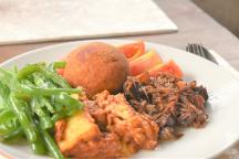 店内はオープンエアで約30席程度、奥にあるショーケース内に並べられたイタリアンおかずから1つずつ自分の食べたいものを指さしで注文するスタイルとなっています。「ラザニアは1つRp22,000、トマトはRp.4,000・・・・」と1つずつに値段が記載されており、初めてバリ島を訪れた方でも安心して注文することができます。今回はライスコロッケを中心に鶏レバーとラザニア、サラダを添え合計Rp60,000(¥480程度)以下と価格もお手頃。味は軽めの味付けで、飽きの来ない料理といった感じでした。