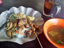 おかずはゆで卵と野菜に鶏肉と豚肉のおかず。そして豚のサテ(串焼き)がついてきます。豚肉は角煮のようなものとバリのソーセージ。それからベーコンと呼ばれる三枚肉をカリッカリに揚げたものが人気です。このベーコンが遅い時間にいくとないことがある、ときいてから自分はいつも12時半前には到着するようにしています。豚肉のサテも柔らかくて美味しい。