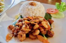 お店のオススメのメニューは、ガーリックバタープラウンRp.50,000(¥400程度)。香ばしく炒められたエビにガーリックの風味が加わり、とても食欲そそる一品で、いくらでもご飯を食べれそうな味わいです。