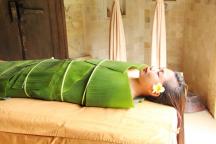 その後ハーブとスパイスをミックスしたペーストでボディパックが施され、バナナの葉で身体を包むというユニークな工程は、ゆっくりと浸透したペーストが身体を芯から温め、女性特有の冷えの改善に効果大!!