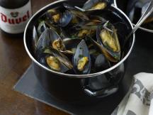 お鍋いっぱいに詰まったムール貝が蒸された状態でテーブルに運ばれてきます。