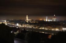ライトアップされたドゥオーモのクーポラ、街灯が整然と並ぶアルノ川、白いファサードが少しだけ見えるサンタクローチェ聖堂。