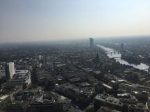 展望テラスがある54階まで高速エレベーターが連れていってくれ、そこから少し階段で登ります。屋上の柵はガラス張りになっています。屋上の展望台からはマイン川や旧市街、フランクフルト中央駅、アルテオーパーなどを見渡すことができ、夕暮れどきから夜にかけての景色が特に美しいと評判です。