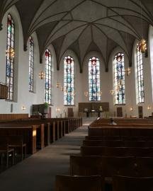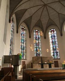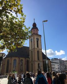カタリーナ教会(福音教会)は1678年から1681年にかけて建てられた長さ約50メートルの大きな教会で、バロック様式の入り口を持つ後期ゴシック様式の建物です。ゲーテの家族が礼拝のためにこちらに訪れていたそうです。とても美しくシンプルな教会です。1944年、第二次世界大戦の火災により教会が破壊され、1954年に再び再建されました。