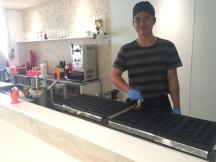 オシャレな店内、実はたこ焼きオーブンの実演もカウンターでご覧になれるようになっています。ローカルに人気の秘訣はここなのでしょうか?