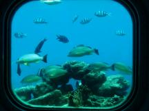 四角や丸い窓から見える海の世界は透き通っていて、色とりどりの魚が見られて自然の水族館のようです。