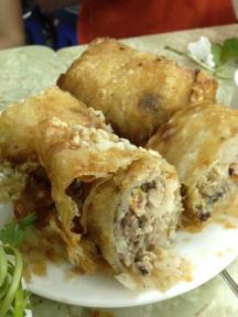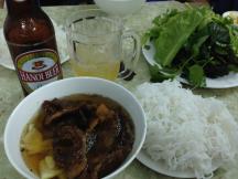 こちらはブンチャーとネム(大きな海鮮揚げ春巻きの様なもの)とハノイのビールがセットで85,000VND(約430円)。