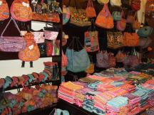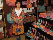 バッグ、財布の雑貨、テーブルクロス、ファッションカバー、スカート、ショールなど。織物は特産の木の皮、コットン、シルクを素材としているそうです。この店もドルが使えます。店でいちばん高かったのがテーブルクロス、85ドル(いちばん生地が大きい)、バッグは40ドル~80ドル(大きさにもよります)、ファッションカバー25ドル、安いものは財布で4ドル~20ドルくらいでした。もっとも、これは店の人の言い値なので、値切り交渉でどこまで安くできるかは未定です。まあ、少数民族の刺繍製品は普通の土産物屋にも売っていますので、比べてみて大体の相場を確かめるのもいいでしょう。でも、この店が少数民族の刺繍製品の品揃えでは一番豊富ですね。色鮮やかで明るく華やかな店内も一見の価値ありです。