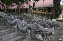 ハノイのタンロン遺跡は、ハノイのホー・チ・ミン廟に近いバーディン地区で発掘された遺跡群です。ハノイの新国会議事堂建設予定地に2003年に発見されました。ハノイ市街中央部に位置していてハノイの市街からは徒歩圏内で行けます。 7世紀~19世紀までの王城の跡が長層的に残っていて、最も古い遺構は中国が支配していた時代の安南都護府だったと考えられています。 1010年にリ・タイトーが建都しタンロンとしました。 以来、ベトナム諸王朝の各時代の遺跡があり、現在では、端門、 敬天殿・龍の階段、後楼、北門、フラッグタワー、タンロン遺跡出土品の博物館などがあります。2010年8月にユネスコの世界遺産(文化遺産)に登録されました。いちばん南側にあるのが端門(Đoan Môn)でタンロン遺跡はここからはいります。前は広い広場になっており、門をくぐると遺跡が一直線上に続いています。端門には五つの出入り口があり、その両脇に楼閣へ上る階段があります。楼閣からは、南側にフラッグタワーが見え、北門から後楼、敬天殿、と城内の主要な建物が南北に、一直線上に並んでいたことがわかります。宮殿がは敬天殿でと呼ばれ、残っているのは龍の階段だけですが、現在の建物は、植民地時代にフランスが建てた建物です。この敬天殿の地下には、ベトナム戦争時代の地下司令部があって見学できます。敬天殿の後ろ(北側)にある三階建ての建物が後楼(Hậu Lâu)です。 皇帝の側室や女官達の控えの場所だったそうです。遺跡の中は樹木も多く美しい公園になっていて、ハノイの街中のオアシスとも言えます。ホーチミン廟、ハノイ軍事博物館などと隣接していますので合わせて訪れてみたいところです。見学は、特にチケット売り場もないようで無料で入れます。
