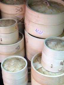 さすがは香港、お店の前には大中小とサイズが豊富な蒸籠が山積みになっています。