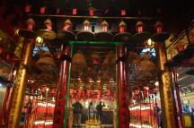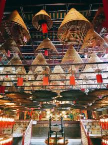 すぐ後ろには高層マンションが建ち並んでいるのですが、一歩中に足を踏み入れると、天井からは無数の巨大な渦巻き型線香がつるされていて、なんだか香港映画の世界に入り込んでしまったみたいな感覚に。