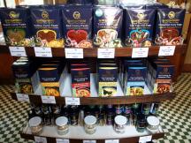 広大な庭を抜けたエントランスには青のバーがあり、その奥の自動ドアを開けるとお土産コーナーがあります。オリジナルのタイカレーのペースト、レモングラスやスイートバジルなどの乾燥ハーブ、ドレッシング、お茶、スナック、食器など幅広い商品があります。