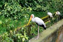 歩いていると、様々な鳥たちに出合います。日本にもいる、ゴイサギ、アマサギがたくさんいました。向こうから歩いて来る七面鳥の一団にも出くわしました。クジャクやかんむりバトも見かけました。池には、フラミンゴや黒鳥、カモがいます。その池の周りでは、シロトキコウ(コウノトリ科の鳥)が数羽うろうろしていました。檻の中には、インコやオウム、さらにはマレーシアの国鳥であるサイチョウもいます。
