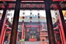 奥に進むと、金色の関羽像が右に養子の関平、左側に配下の武将周倉を従え祀られています。関帝廟は、それほど大きくはありませんが、時代を感じさせる建物で、見応えがあります。門前の獅子や屋根に飾られている宝珠、中庭にある香炉、文字が刻まれた柱など細部に注目してみると面白みが増します。商売をしている方は、真剣にお参りしてみるのもいいかもしれません。