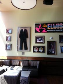 ロックに関する展示物に囲まれていただくアメリカ料理