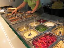 お店に入ったら、まずはカウンターで注文する。お茶やジュースの飲み物類はセルフサービスなので、レジで受け取った空のコップを持って、自分で注ぎに行く。もし機械の使い方がわからなければ、近くのスタッフに尋ねよう。お茶はティーポットで75ルーブル、コーヒーは90ルーブルから。