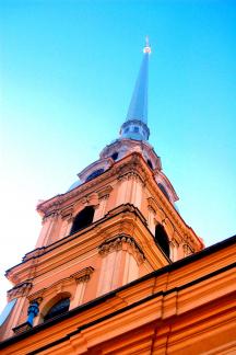 サンクトペテルブルグの中心を流れるネヴァ川沿いを歩いていると、きらきら光った金色の塔が見えると思います。この塔をよ〜く見てください。上の部分に実は天使がいます。(サンクトペテルブルクには、建物の彫刻など、天使があしらわれていることが多いんです。)この黄金の天使の塔が見える一帯が、「ペトロパヴロフスク要塞」です。