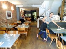 むき出しレンガの壁にスチールのテーブル、シンプルな木製の椅子というトレンドを取り入れた