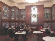 この部屋そのものが博物館の展示物とも言えます。カフェとして使われている部屋は全部で3つ。19世紀の英国を代表するデザイナー、ウイリアム・モリスが作った「モリスルーム」。金色の照明が目を惹くゴージャスな「ギャンブルルーム」、青い模様のタイルが印象的な「ポインタールーム」があります。歴史的な部屋でなく、新しく作られたスペースは、広い窓を持つ明るい廊下に白を基調としたテーブルや椅子が並んでいます。 このような由緒を持つカフェですが、お値段は「街中のコーヒーチェーン店の水準」です。ケーキとお茶で6~8ポンド、しっかりとしたランチメニュー(メインディッシュ)が1品9~12ポンドとなっています。