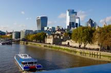 橋の上から北西を眺めたところ。右手前はロンドン塔、奥は金融街のビル群、左端に小さく見えるのはセントポール寺院