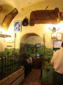 観光に疲れた方は奥のテーブル席へ。見回すときのこの内装が派手でかわいく癒されます。夜だとここにエレクトーンを弾くおじさんがいて日本人とわかればすぐに日本の曲のナツメロを弾いてくれます。最後に1ユーロくらいチップを渡しておきましょう。ただこのテーブル席、このカラオケのお陰で夜は少しうるさいので同行者との会話が聞き取りにくいのが難点。一番いいのはカウンター席でマッシュルームの鉄板焼とビールをつまんで次のお店に移動、というパターンです。