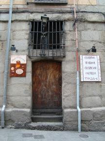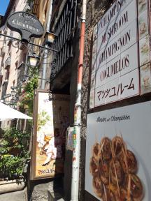 ソル広場からマヨール広場に入って対角線に進むとArco de Cuchilleros(Cuchillerosのアーチ)の階段を下りることになります。そこを廻り込んで少しいくと右手につたないカタカナで「マッシュルーム」と掲げているお店がMeson de Champiñon(マッシュルームの居酒屋)です。この通りは飲み屋街になっていて他にも専門料理の飲み屋が並んでいます。一番賑わっているのがここ。