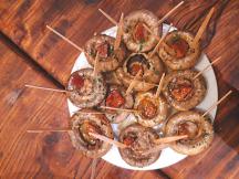 マッシュルームの上に小さく刻んだ生ハムに少量のオリーブオイルを垂らして塩とハーブをふってオーブンで焼く、