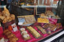 カトリックの国スペインでは季節の行事毎に頂く郷土菓子があってここのショーウィンドウで眺めることができます。スペイン菓子、ケーキ、マカロン(1個1ユーロ)、チョコレート、パン、惣菜パンなどを取り扱っています。惣菜パンではEmpanada(エンパナーダ・パイ生地のようなものに具が入ってる)やCoca(スペインの薄いピザ)、ケーキでは上にアーモンドと粉糖がかかってるパイクリームが名物です。お勧めはやはり季節のお菓子です。例えば、11月1日は日本のお盆のような日でみんなでお墓参りにいく人が多く、骨の形をしたお菓子やシュークリームのようなものを食べます。1月6日にはRosconと呼ばれるケーキをホットチョコレートと一緒に頂きます。この時期は皆、列を作って買いにきます。その他、サンティアゴケーキ、Tocinillo de Cielo(卵の黄身のみのプリン)もあります。ショーウィンドウを覗き、指をさしてジェスチャーで注文してもいいでしょう。量り売りですが1個単位でも購入できます。