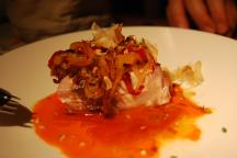 お勧めはTaco de bonito con piperrada(かつおとPiperradaソース)13,50ユーロ。たたきのように周りを焼いて中はちょうどよいレアに仕上げPiperradaという北のピーマンを使ったソースが絶妙に合います。上にはなんとかつおぶしがかかっています。Bocarte de frito sobre tomate(小イワシのフライとトマト)9,75ユーロなど他の魚のメニューも素材の味を大切にしています。マヨネーズたっぷりですがEnsaladilla Rusa(スペインのポテトサラダ)8,50ユーロも人気です。