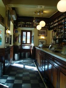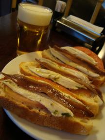 長細い店内は奥に数席テーブルがあるだけで後は基本的に立ち飲み。アンティークなマドリードのバルの造りが素敵です。壁には世界中のビールの瓶や缶が飾られており、日本のビールを探すのも酒のつまみです。ここはMahou(マドリードのビールメーカー)お墨付きのお店なので上手に注いでくれるカーニャ(生小ビール)を大半の人が飲んでます。ビールのお供にはMontado de Anchoa con Boqueron(小いわしの酢漬けとアンチョビとトマトが乗ったトースト)とちょっと汁は垂れますがPepinillo Relleno(ドイツ風ピクルスの詰物)1個1ユーロ、Canape surtido(カナッペの盛合せ)13ユーロ、少し高いですがMejillones(ムール貝)10ユーロがお勧めです。ごみは日本人には抵抗ありますが下に捨ててしまって問題ありません。ビールやアルコールを頼むとちょっとしたつまみもついてくるのも嬉しいです。