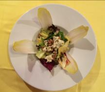 私が行った日に選んだのは、前菜がマンゴの花とチコリとブルーチーズのサラダ・蜂蜜とマスタードのドレッシング。メインには、トルコ風ルシアン・ステーキを選びたかったのですが、売り切れだというので、ベトナム風チキン。デザートにはグラナダ名物の甘いケーキの自家製ピオノノ。