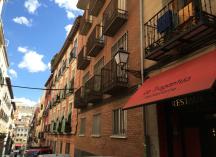 マドリード特有の美しい下町のマンション風景の中、緩やかな坂道を左に上がって少し歩くと左側に見えてくる赤い廂のあるレストランが、目指すラ・トラガントゥアです。