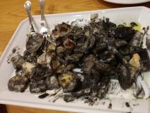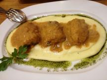 イカのフライは、仕上げにテーブルの上で特製アリオリソースとイカ墨と混ぜ合わせ、ソースがムースのように絡みあう一品です。