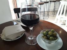 エンパナーダやトスタを準備している間に、赤ワインとアセイトゥナス(オリーブの実の酢づけ)がサーブされました。