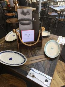 広い店内の至るところ、そしてカトラリーからナプキンに至るまでオリジナルの紋章入りで、目で見ているだけで楽しく、こだわりを感じます。客席後ろに飾られたイタリア製の真っ赤なモーターバイクやヘルメットも目を引きます。レンガ造りのアーチの壁や、奥にびっしり並んだワインのボトルなど、あちらこちらにイタリアの風を感じる工夫がたくさん。