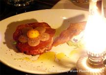 オススメの料理はウズラの卵をくずしていただくタルタルステーキ(20ドル)。