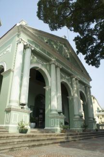 円柱が並ぶ威風堂々としたファサードとペパーミントグリーンの外壁が特徴的。1860年に建てられた中国初の西洋式シアターで、現在でも地元マカオのオーケストラのコンサート会場となるなど、現役で活躍する施設です。2012年から内部見学が可能と成りました。