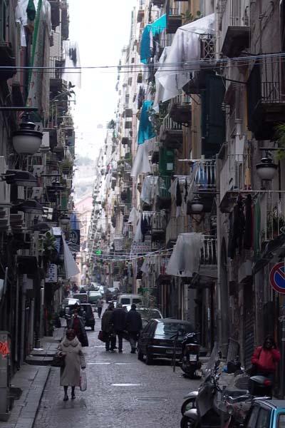 ショッピングストリートでもあるナポリの中心地トレド通りの西側に広がるスペイン地区(もともとスペイン軍のために建設された地区だった)は、丘に続く細い通りに各国の国旗がはためき一瞬素敵そうに見えますが、立ち入らないようにしましょう。トレド通りと比べると明らかに異質な雰囲気があるので間違って入ってしまうということは少ないかと思いますが、この地区は薄暗く細い路地ばかりで人通りもないのでひったくりの温床です。たとえ明るい時間帯でも立ち入らない方が良いでしょう。細い路地をスクーターで駆け抜けひったくりをする少年も多いです。