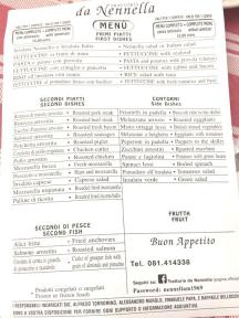 * 個々の品の値段もメニューには書かれていないので、自分で確かめてください。決して豪華なメニューではありません。しかし、ナポリのマンマの料理を味わうには、ここ「トラットリア・ダ・ネンネッラ」は、行ってみて必ず損はしない店です。