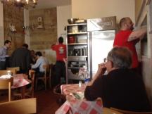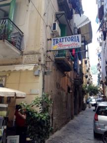 店の前の路地にもオープン席を設け、旧市街の雰囲気を感じることが出来る他、このトラットリアは少し特別。ナポリッ子特有の快活さと人懐っこさでもって、訪れる客たちをもてなします。それはもちろんナポリ弁で、なのですが、何しろ観光客にも有名な店なので、ブロークンな英語で対応してくれます。時には、店員自身の冗談小噺を聞かせたいがために、客に対して口を閉じ耳を傾けることを要求することも。それらも全て親しみある態度で行うので、私たち客は、道端でのお笑いを見せられている感じになってしまいます。
