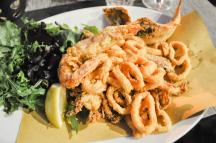 ミックスシーフードフライの盛り合わせ(Fritto Misto di Pesce/25.5ユーロ)は、イカ、エビ、そしてお魚が軽く揚げられたボリュームたっぷりの1品! たっぷりレモンを絞っていただきましょう。