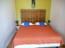 こじんまりしたフロント、天井の高いレストランを通り過ぎると、小さな池に架かる橋とそれに続くデッキ遊歩道、その先に12棟のバンガローが左右に見えてきます。素のままの木を生かした広々したバンガローは、外観・内装に鮮やかなイエロー・ブルーのペンキがアクセントカラーに。室内のベッドカバーはオレンジ、壁にはパパイヤの実が大好物と言われる保護鳥ウベアインコの絵やgecko(ヤモリ)のユニークなモチーフがポップな感じ。清潔なリネンの寝心地良いラージサイズのベッド、シンプルな木製家具…とすべてがこざっぱりしています。豪華ではないけれど、アットホームな隠れ家的雰囲気のカジュアルバンガロー。