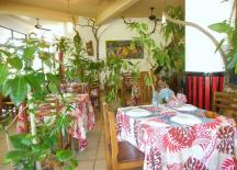 店内の他、小さな庭にもテーブルが並べられており、ジャングルの中で食事しているよう。