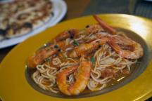 頭のついた丸々太ったエビがパスタに盛り付けられています。