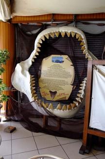 巨大ザメ、メガロドン(絶滅)の化石が。この前で記念写真を撮ることも忘れずに!