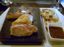 席に着いたらまずは主役の肉を。地元産、アンガス、ニュージーランドの3種のビーフはフィレ、サーロイン、Tボーン、アバラロース、バラなど色々な部位から選べます。他には鶏のササミ、鴨の胸肉、仔牛と鶏肉のデュオも。肉が苦手な方はキハダマグロやシーフードミックス(エビ・マグロ・ホタテ)を。2種類選べる付け合せはフレンチフライ、ポテトグラタン、インゲン、グリーンサラダ、季節の野菜、ライスと豊富。かなりのボリュームで付いて来るので、2人で食べるならそれぞれ違った付けあわせを選ぶのが正解。